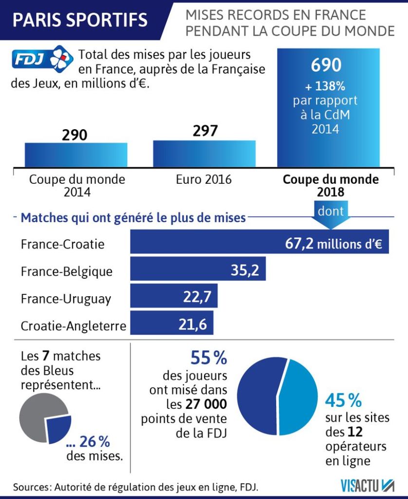 Une somme record ! Le Mondial 2018 de football a généré 690 millions d’euros de mises en France, via les réseaux de La Française des jeux (FDJ) et des opérateurs de paris sportifs en ligne, soit plus du double que lors de l’édition 2014.